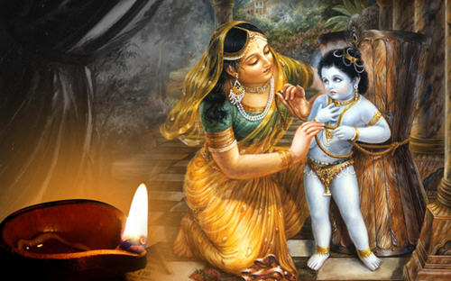 Srila Visvanatha Chakravarti Thakura says that the incident of Krishnaís breaking the pot of yogurt and being bound by mother Yashoda took place on the Deepavali Day. This pastime is elaborately described in the ninth chapter of the tenth canto of Srimad Bhagavatam.