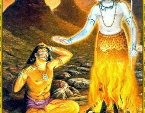 There wasa demon named Vrkāshura. He had a great desire that whenever he would touch someone’s head, it would be burnt to ashes. Hoping to achieve such a benediction, he one day lit a sacred fire in a secluded place and began to offer pieces of flesh from his own body. By Vrkāshura’s severe austerity, Lord Shiva became very pleased and requested him to take his desired benediction.