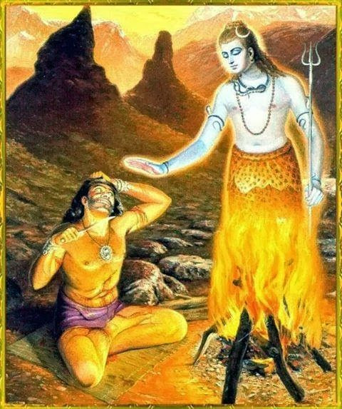 Vrkāshura replied, “My dear boy, I was cutting the flesh from my bodily limbs and offering it in the fire of sacrifice just so that I could get the benediction that whoever’s head I touch would be burnt to ashes. Just to test this benediction, I wanted to touch Shiva’s head but he ran away in great fear.”