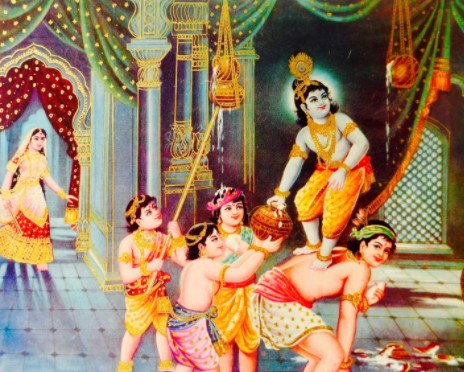 So, one day while the Gopi was busy in her house, she heard some sounds coming from the room she kept her butter in. Tiptoeing she went and found that Krsna and all his friends were raiding her fresh stock of butter. She ran and caught Krsna by his hand, while all His friends ran to the exit.
