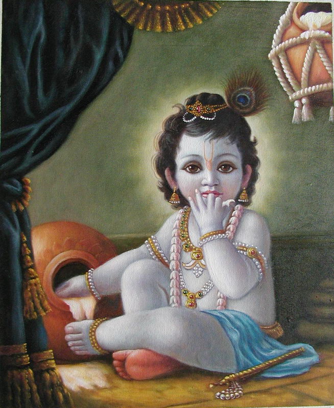 One day while Yaśodā was outside the house engaged in some domestic activities, inside the house Krishna stole butter again. When Yaśodā returned and called out, “O my darling Krishna! Where are You and what are You doing?”