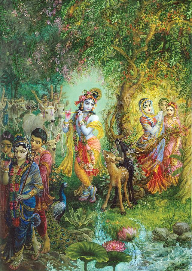 When the young ladies in the cowherd village of Vraja heard the song of Kṛṣṇa’s flute, which arouses the influence of Cupid, some of them privately began describing Kṛṣṇa’s qualities to their intimate friends.