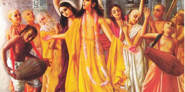 When the rivers hear the flute-song of Kṛṣṇa, their minds begin to desire Him, and thus the flow of their currents is broken and their waters are agitated, moving around in whirlpools. Then with the arms of their waves the rivers embrace Murāri’s lotus feet and, holding on to them, present offerings of lotus flowers.