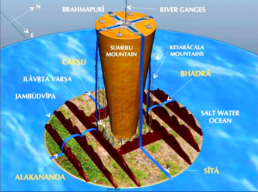 The living entities residing on Sumeru Mountain are always very warm, as at midday, because for them the sun is always overhead. Although the sun moves counterclockwise, facing the constellations, with Sumeru Mountain on its left, it also moves clockwise and appears to have the mountain on its right because it is influenced by the dakṣiṇāvarta wind. People living in countries at points diametrically opposite to where the sun is first seen rising will see the sun setting, and if a straight line were drawn from a point where the sun is at midday, the people in countries at the opposite end of the line would be experiencing midnight. Similarly, if people residing where the sun is setting were to go to countries diametrically opposite, they would not see the sun in the same condition.