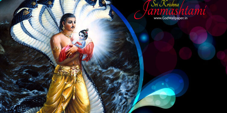 In the middle of the night Vasudeva carried His little baby boy to Gokul. By the Divine arrangement of Yogamaya, all the soldiers that were guarding Vasudeva and Devaki fell into a deep sleep. All the chains that shackled them and all the doors opened on its own. The weather turned into a severe thunderstorm. It was a dark night but when Vasudeva was carrying his child across, He could see perfectly clear due to the effulgence from Vāsudeva Krsna’s body.