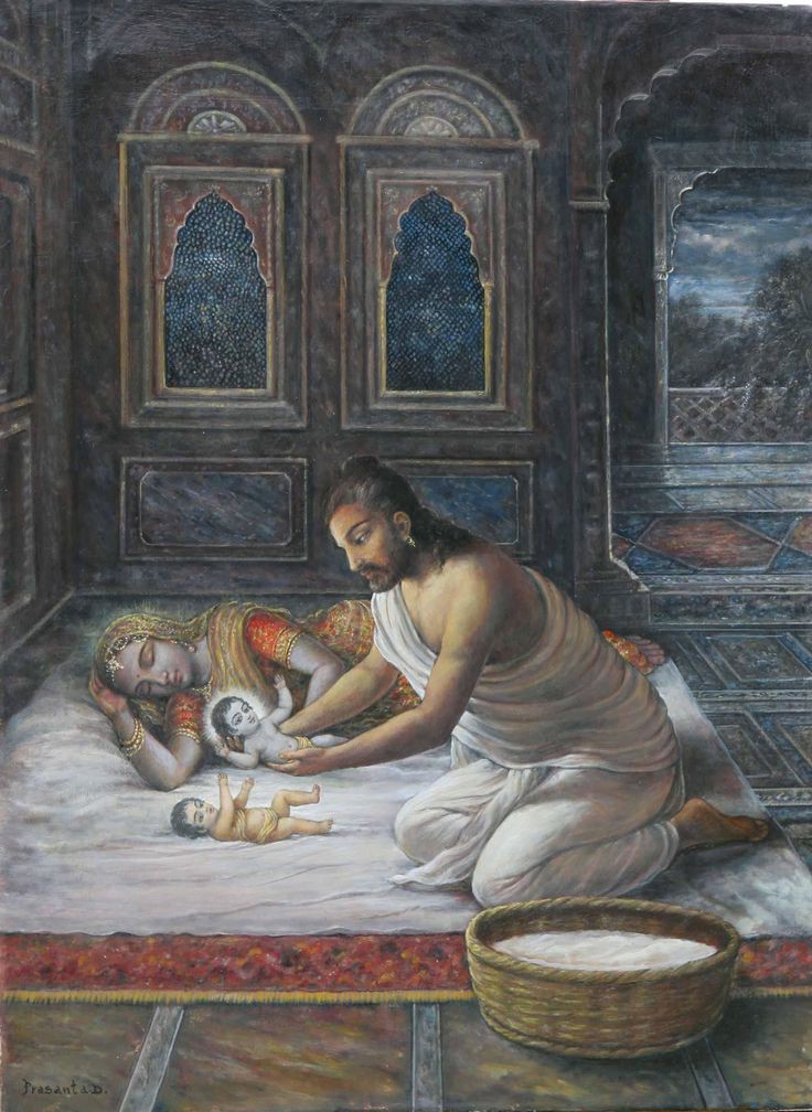 Nanda Baba was milking the cows and the nurse came running to him. She could not speak, she just stood there with her mouth opened but everyone could understand that Mother Yasoda had giving birth. Everyone just ran to the maternity house.