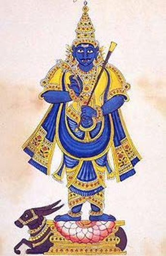 There very soon among Death and Time, he sees Lord Yamaraja with red eyes, looking fierce and dark like a heap of collyrium, with fierce jaws and frowning fiercely, chosen as their lord by many ugly, fierce-faced hundreds of diseases, possessing as iron-rod in his hand and also a noose. The creature goes either to good or bad state as directed by him.